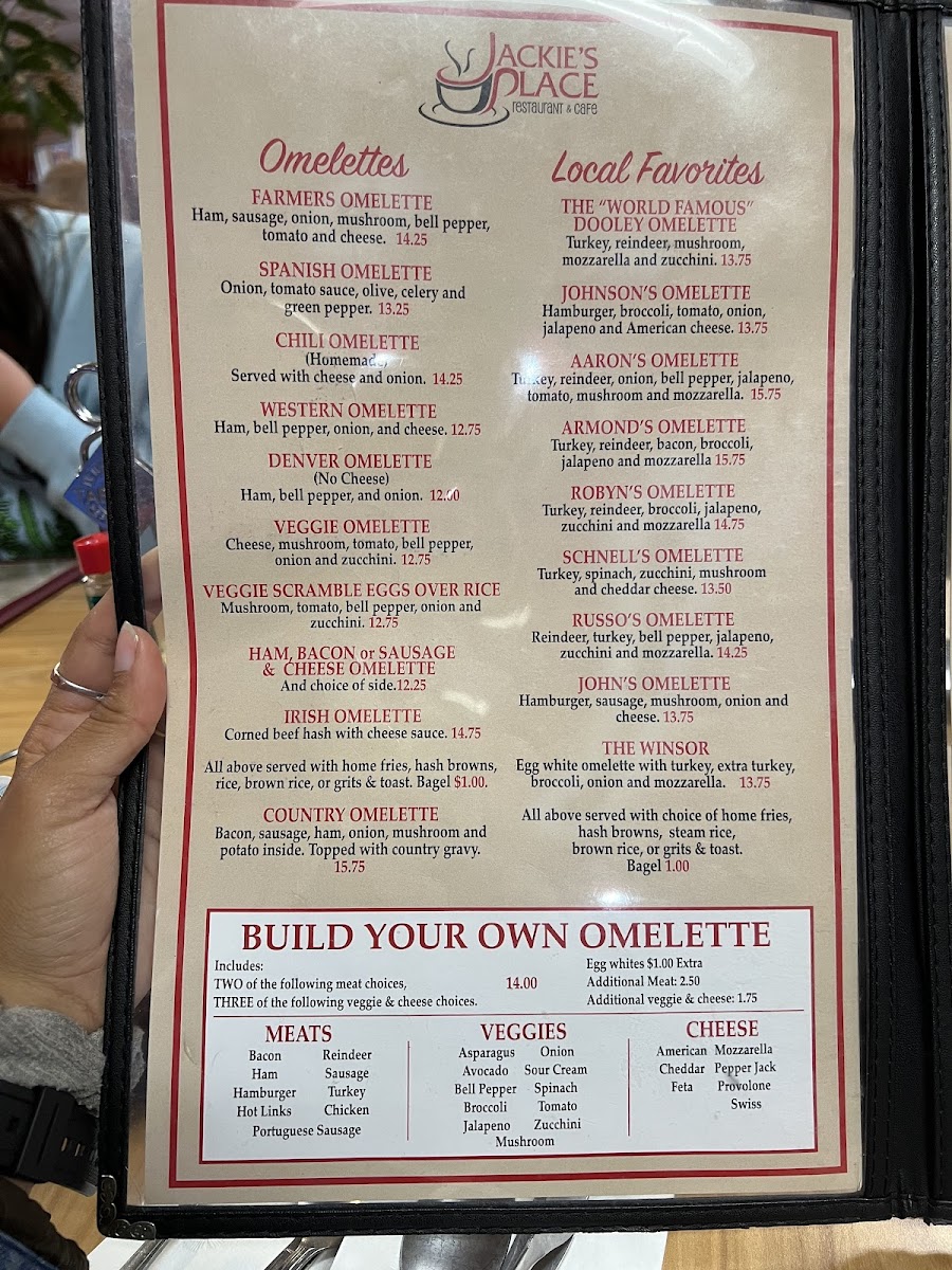 At Jackie's Place, the omelette menu reigns supreme, featuring a variety of creative and hearty selections that cater to every palate. One standout is the Johnson's Omelette Hamburger, bursting with fresh ingredients like broccoli, tomatoes, onions, jalapenos, and gooey cheese – all for just US$17.75. For those who prefer a twist, try their Chili Omelette, which comes generously topped with cheese and onions, also priced at US$17.75.